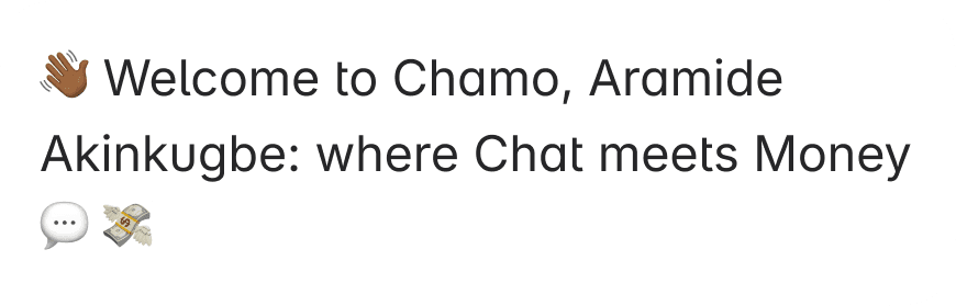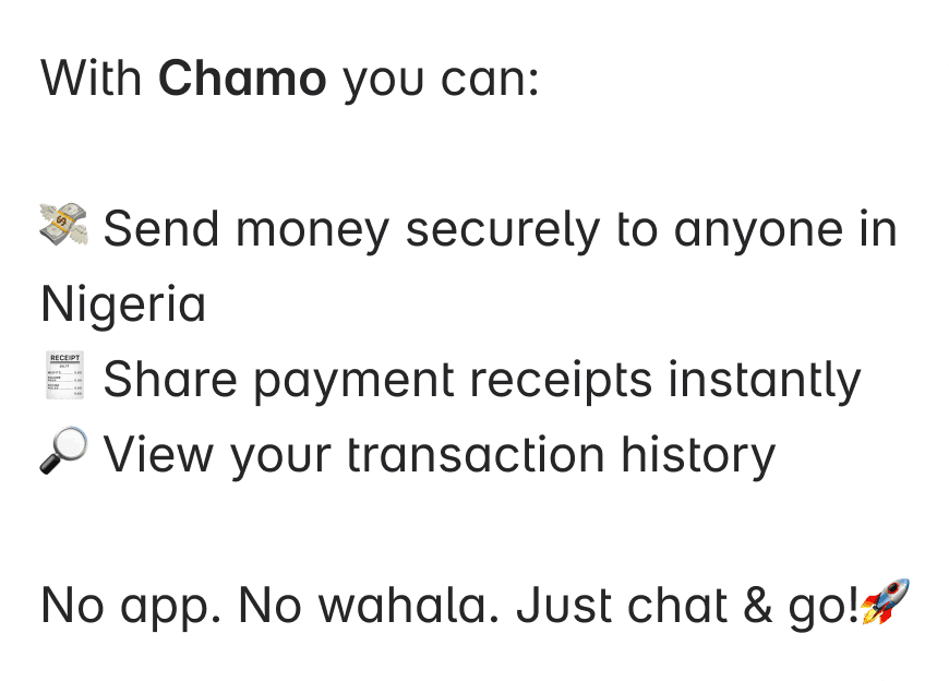 Chamo lets you send and receive money directly on WhatsApp.